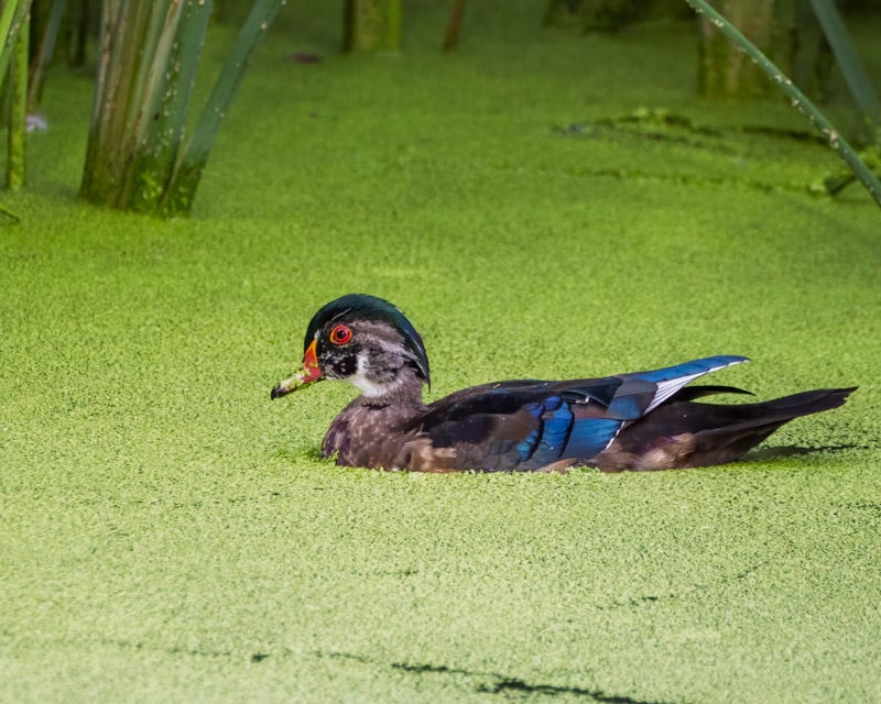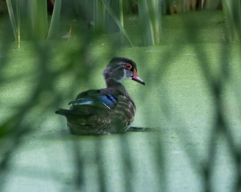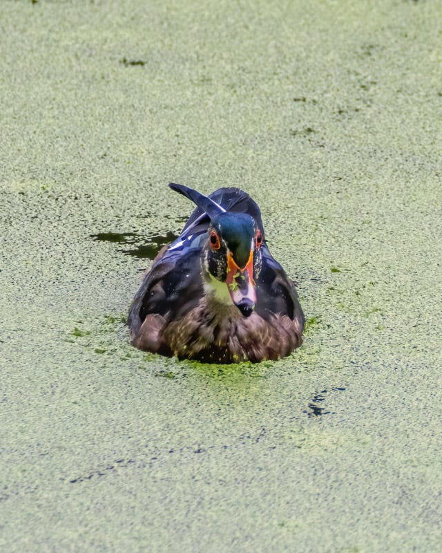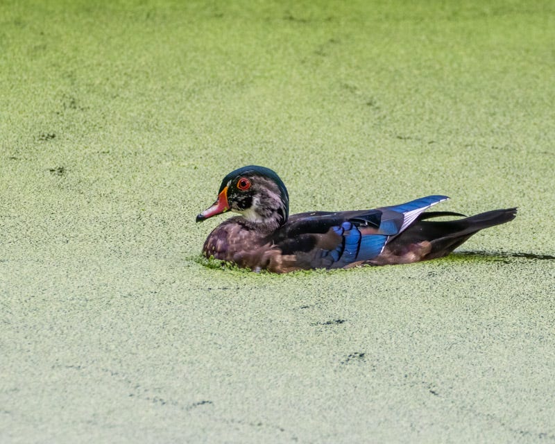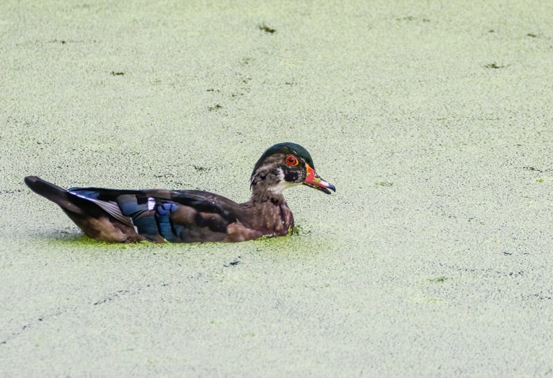 Swimming through duckweed, today’s duck at Sweetwater has a ways to go before it becomes a handsome duck once again.