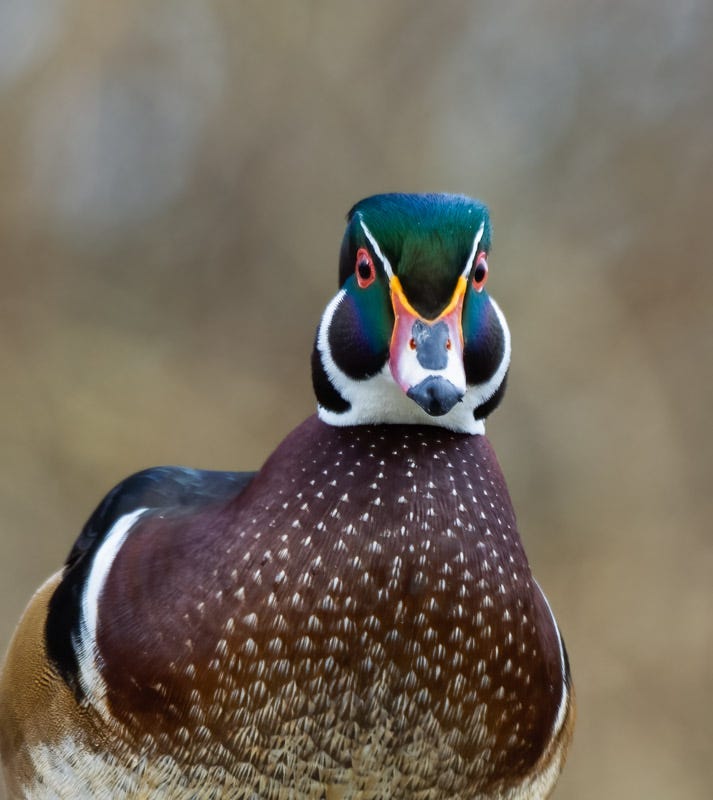Below is a front facing view of the current eclipse Wood Duck to compare to the duck in the shot above. Although the bill, eyes, and top of its head look similar, the rest of the Wood Duck is very, very different.