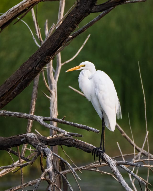 The pair of Egrets spent much of their time near each other in some of the snags (dried and dead tree skeletons) on the southwest end of the lake. After a short time together one or the other of the birds would take to the air, fly around the lake, and then return to a nearby perch in the same group of snags. As they approached the other bird in the snag, they would make a croaking sound that carried across the lake on the quiet morning. The second call at this AllAboutBirds site is the sound we heard most often.