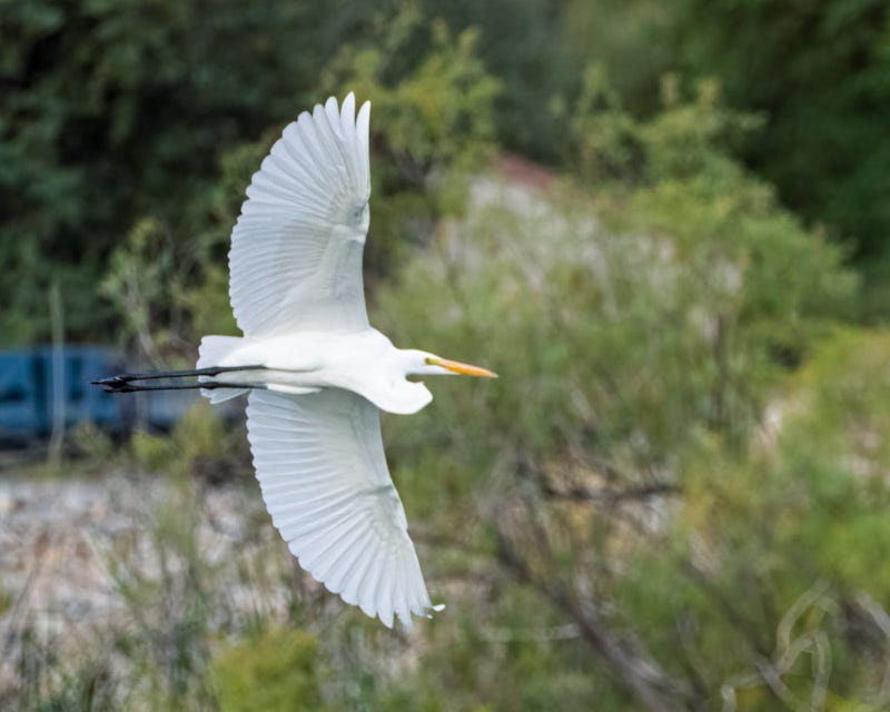 Great Egrets are large, long-legged wading birds, measuring over 3 feet from bill to tail. Their wingspan (tip-to-tip) is about 5.5 feet. They fly slowly but with powerful wing beats. The sweep of their wings is beautiful to watch.