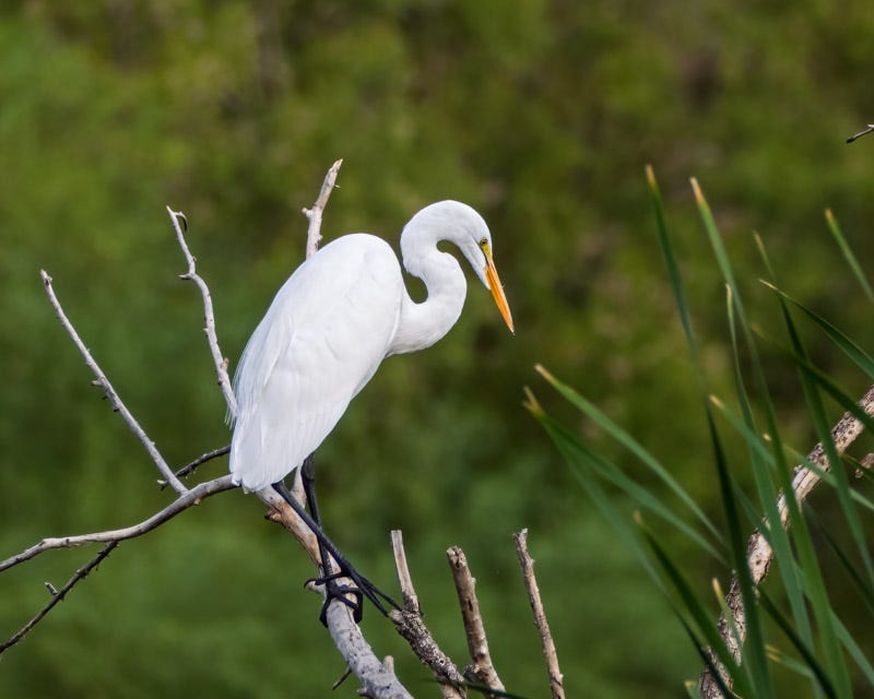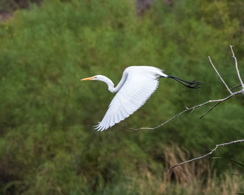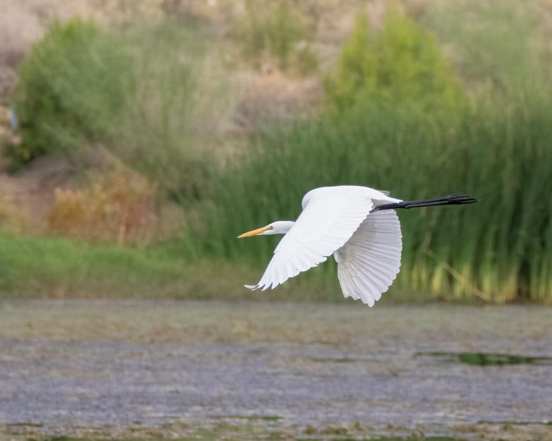 Sometimes the birds circled low. Of course, on the return route you have reeds and other vegetation lining the flight of the Great Egret as they skimmed over the water. Great Egrets can be identified by their overall, look of course, but they have long yellow/orange bills and black legs. Those characteristics differentiate them from another white wintering Egret, called a Snowy Egret.