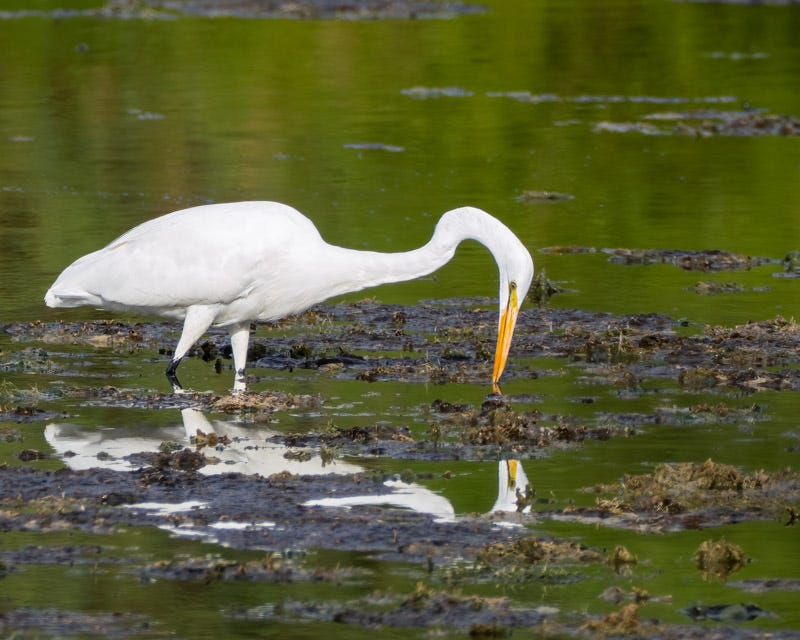 One Great Egret seemed to be studying life under the surface very closely. It was intent on peering through the water for fish. Great Egrets hunt in typical heron fashion, standing immobile or moving slowly through the water to capture fish with a jab of their bill.