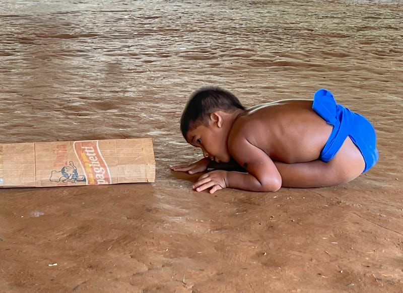 The photo of the village (above) shows a very large, open air structure. That is the gathering space for the community. It has a thatched roof and natural floor. We listened to and watched a number of presentations on the history, culture, and traditions of the Embera way of life. During the presentations the children played. This young man was fascinated by the many ways he could fold and manipulate this cardboard.