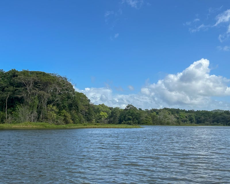 The river travels through the lush rainforest of the Panama Canal watershed and into the Gatun Lake.