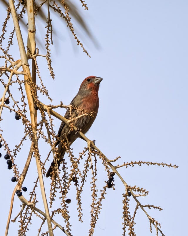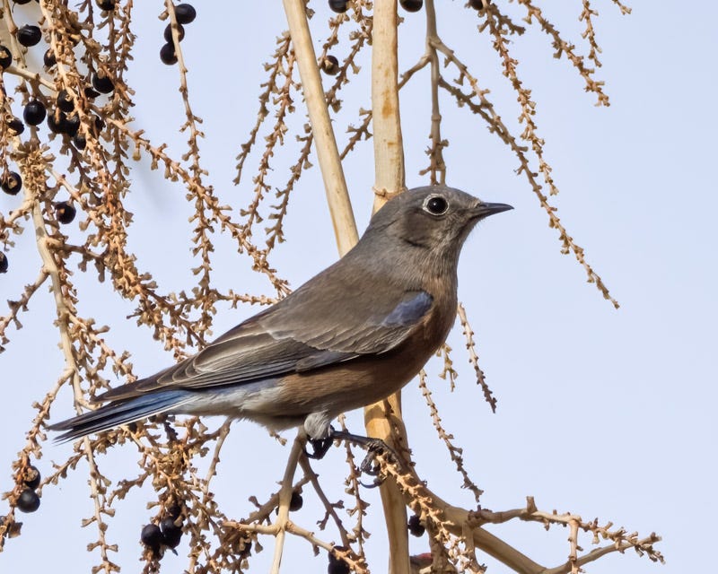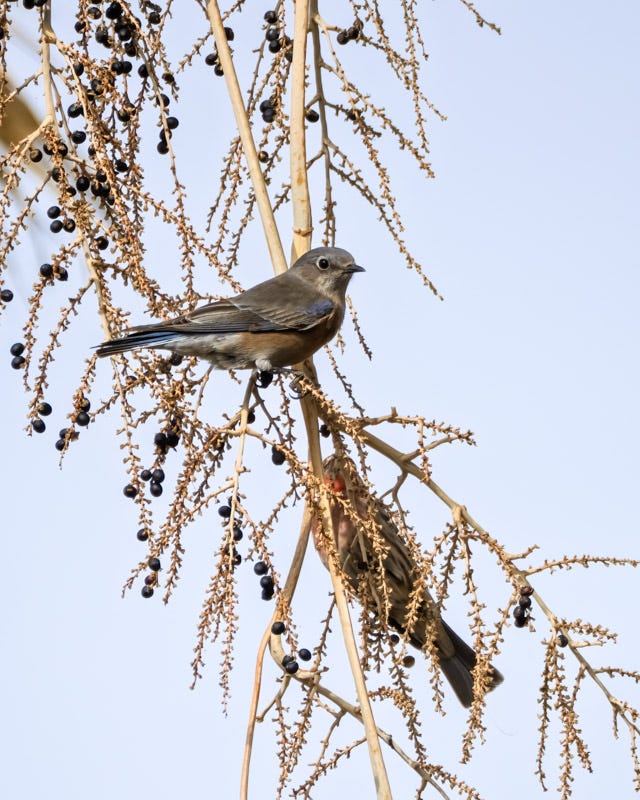 The palm trees lining the field at Reid Park had already been stripped of most of their fruit, but this western Bluebird still had plenty to choose from. It was sharing the bounty with a male House Finch.