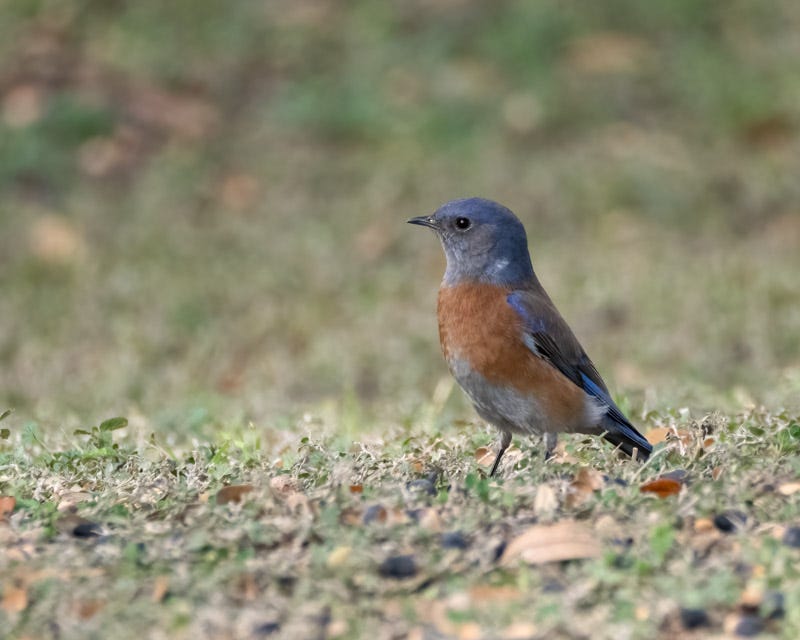 On the ground, the Western Bluebird shows his short, thin bill. During the summers Western Bluebirds eat mainly insects. During the winters, they eat mostly seeds and fruit. Western Bluebirds can be seen in many Tucson parks due to the amount of sweet berries that the palm trees produce. You can see a few on the ground around this bird.