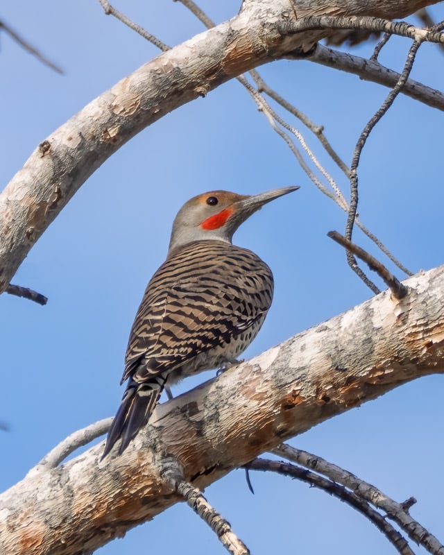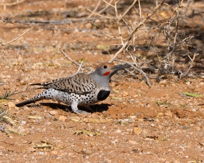 About one week later after I saw that Gilded Flicker, I saw a Northern Flicker. The Northern Flicker looks similar to the Gilded Flicker but with a smaller tan cap and gray on the back of its head. The Northern Flicker also seems to have more black on its back than the Gilded does. Although not visible in my photos, the Northern Flicker has red or orange-red linings under its wings and similarly colored feather shafts on those feathers. Gilded Flickers’ wing linings and feather shafts are more yellow (i.e., gilded). Northern Flickers in the west are also called Red-shafted Flickers. Male Northern Flickers also have red mustaches just as male Gilded Flickers do.