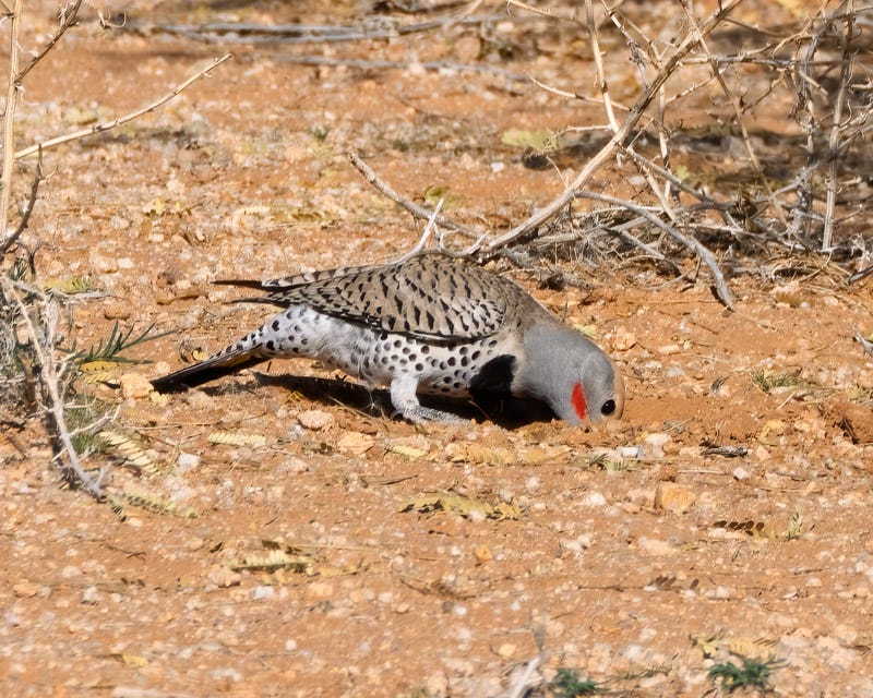 Here the Gilded Flicker was hard at work, digging up the earth in search of ants, its head buried in the ground. You can see the brown back this woodpecker has. The black bib and spotted underside is also a characteristic of Gilded Flickers. The males have a red mustache. In the United States, Gilded Flickers are birds found mostly in the Sonoran Desert.