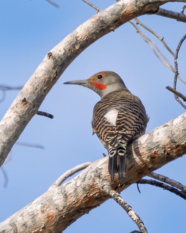 Both species of Flickers have a conspicuous white rump patch. Commonly visible during flight, this perched Northern Flicker is showing us that white rump patch which sometimes can be seen while the bird is perched. Birdnote tells us a bit more about Northern Flickers.