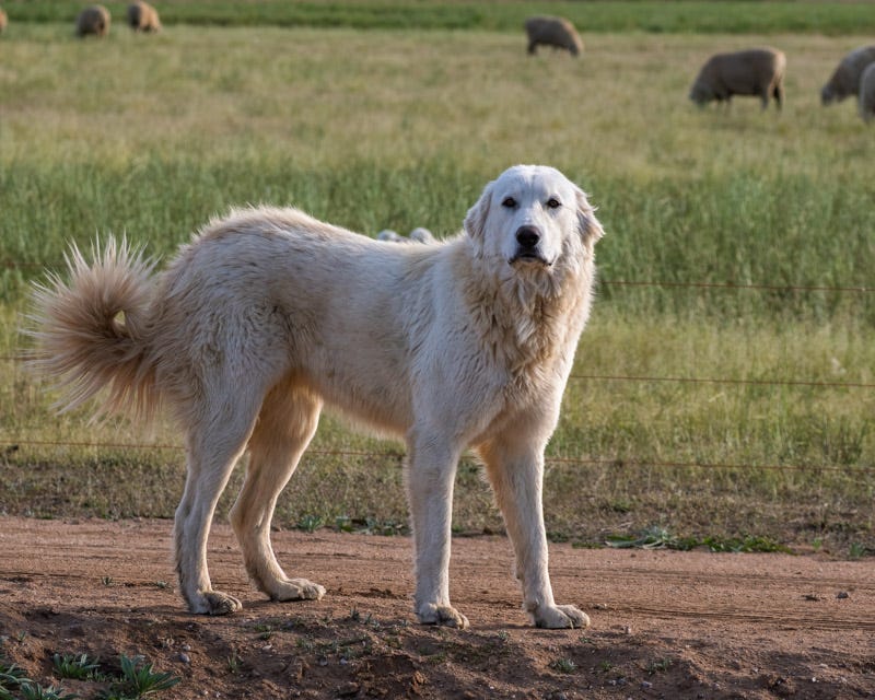 Accompanying the sheep are a breed of dog developed by Basque Sheepherders who came from the Pyrenees Mountains between Spain and France. The dogs are called Great Pyrenees. They stand about two and a half feet tall and can weigh well over 100 pounds. They are guard dogs, not sheep dogs. Their job is to protect the flock from predators.