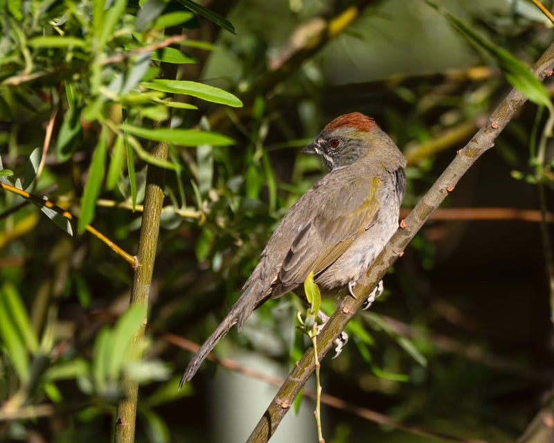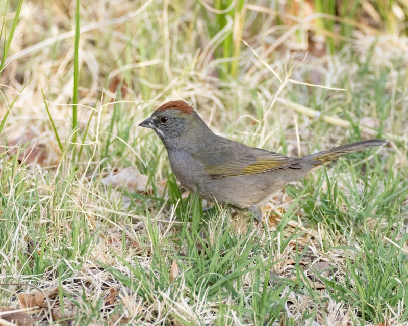 Green-tailed Towhees are known for their yellow-green wings and tail. They have a rufous crown, a mustache stripe and a white throat. The white throat is not seen in these photographs.