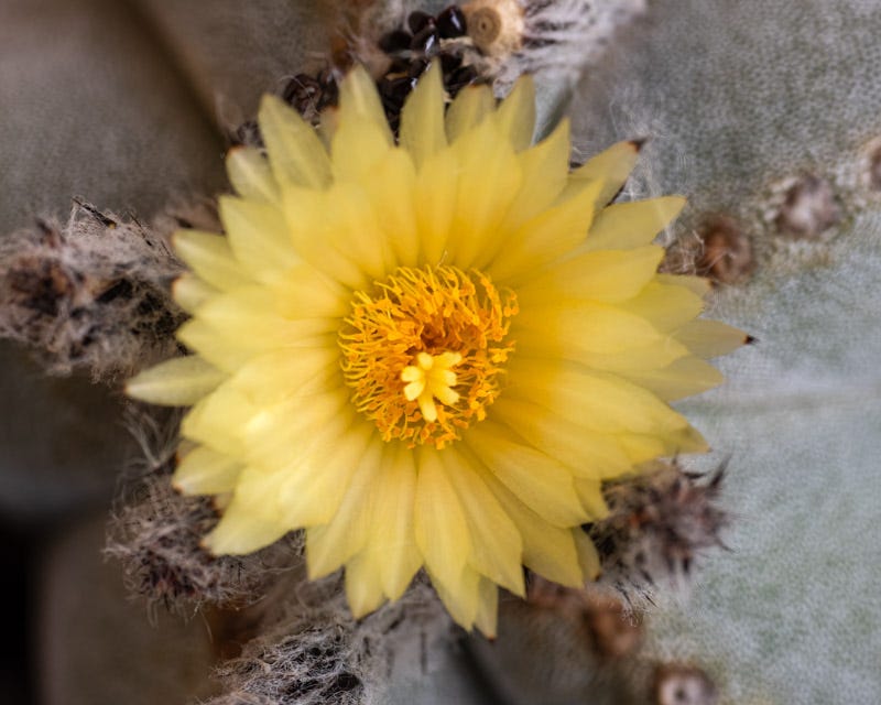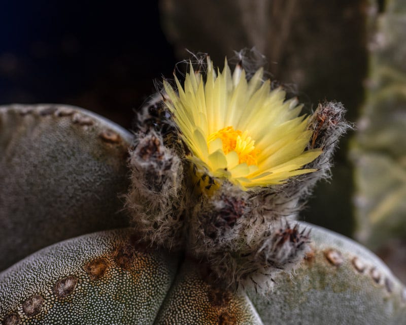 A Bishop's Cap cactus flowers periodically.