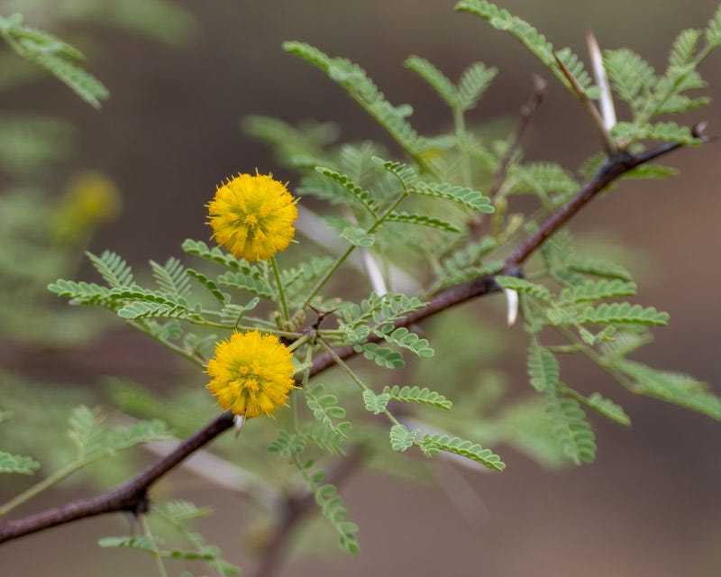 A Whitethorn Acacia plant is flowering. I have Cat's Claw Acacia in the yard and the Whitethorn is in the nearby desert. The Cat’s Claw is not flowering at this moment.